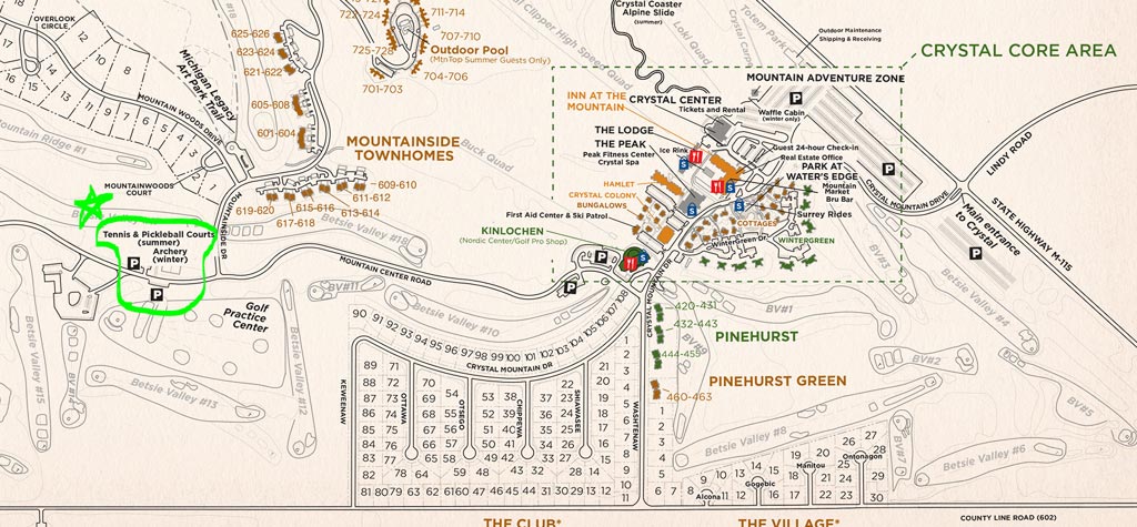 Parking: Art Park on Mountain Side Drive or at Tennis Courts / Driving Range on Mountain Center Rd. (See image below)