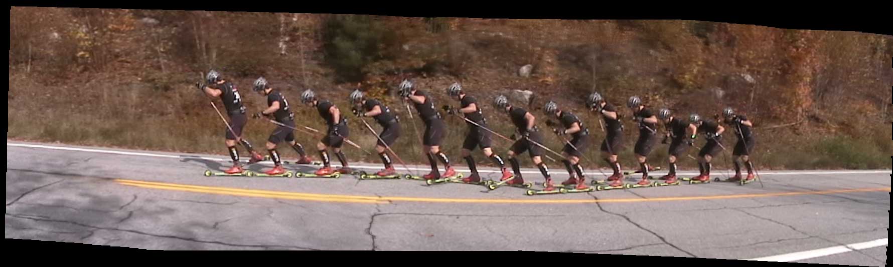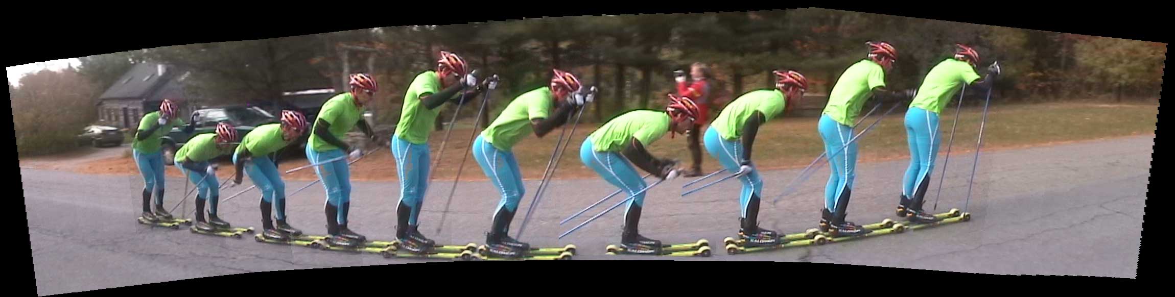 First, it can provide a a sequence of pictures showing a particular technique in detail. If you've done video analysis in the past, you know how difficult it was for the coach to stop the video at the exact instance needed to examine some aspect of your technique. With Dartfish system, stills are pulled from the video - just fractions of a second apart. You get to see all parts of your technique at once. (See the Kris Freeman and Andy Newell Dartfish photos below).Kris Freeman doing V2, captured by Dartfish video analysis