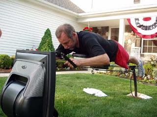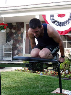 Greg goes at it. Notice he's actually off the heels of his shoes, trying to get more abs action: