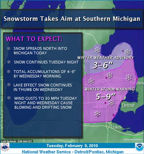 A Winter Storm Warning is in effect through mid day Wednesday south of US-10. A Winter Weather Advisory is in effect for the same time period along and north of US-10. A developing snow storm will produce 3 to 6 inches of snow in the advisory area and 5 to 10 inches in the warning area through mid day Wednesday. The heaviest snow will fall this afternoon and evening. Winds will increase Tonight and cause blowing and drifting snow. Near blizzard conditions will be possible along the lake shore late tonight into Wednesday.